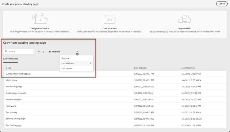 랜딩 페이지 콘텐츠 디자이너를 엽니다. 이전에 저장된 모든 템플릿 목록이 표시됩니다.