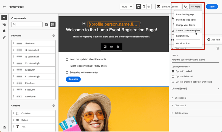 랜딩 페이지 디자이너를 사용하여 원하는 대로 콘텐츠를 편집합니다.