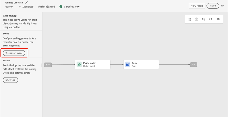 테스트 단추를 클릭한 다음 이벤트 트리거를 클릭합니다.