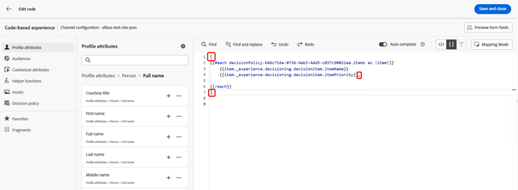 콘텐츠에 의사 결정 정책을 추가한 후에는 개인화를 위해 반환된 의사 결정 항목의 속성을 사용할 수 있습니다. 이렇게 하려면 먼저 의사 결정 정책 코드를 콘텐츠에 삽입합니다.
