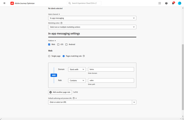 규칙과 일치하는 페이지을(를) 앱 구성으로 선택하고 페이지 URL을(를) 입력하십시오.