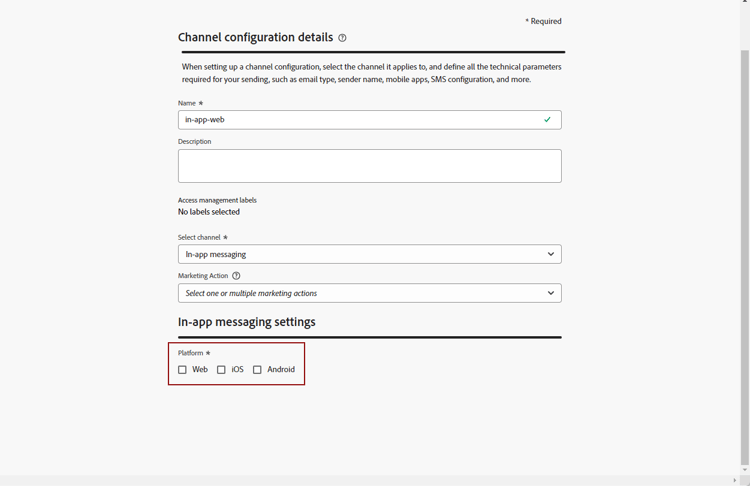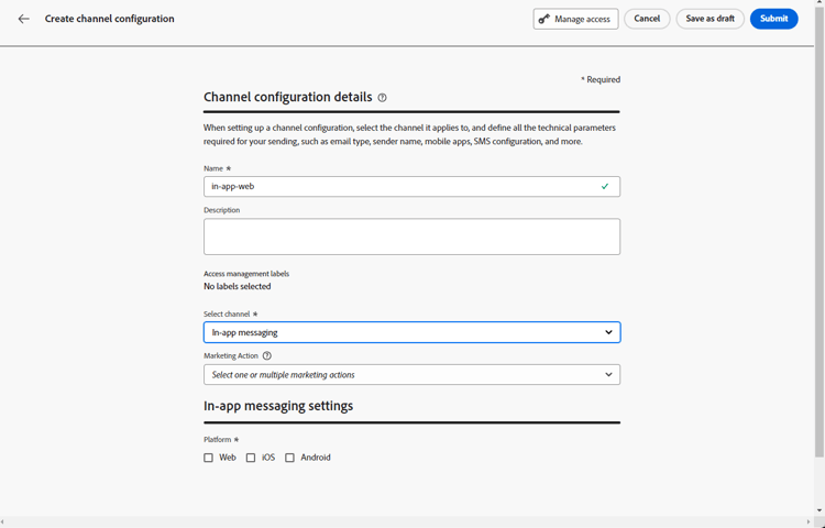 - 이 섹션에 자세히 설명된 대로 관리 > 채널 > 채널 구성에서 인앱 메시지 채널 구성을 만듭니다.