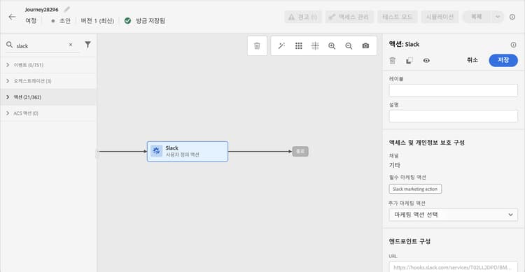 여정에서 Slack 마케팅 작업으로 구성된 Slack 사용자 지정 작업을 사용할 때는 관련 정책이 활용됩니다.