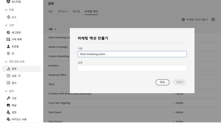 정책 메뉴로 돌아가서, 마케팅 액션 탭을 선택하고 마케팅 액션 만들기를 클릭합니다. 마케팅 액션을 여정에 사용되는 각 채널마다, 각 서드파티 사용자 정의 액션마다 하나씩 만드는 것이 좋습니다. 예를 들어 Slack 사용자 지정 액션에 사용될 Slack 마케팅 액션을 만들어 보겠습니다.