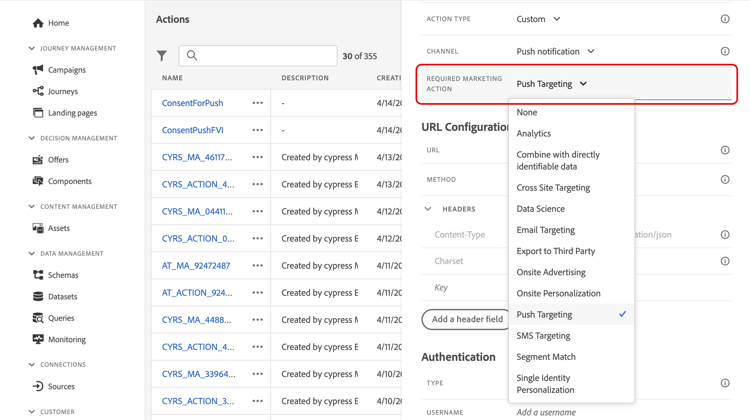 - 여정에 사용자 정의 액션을 추가할 때 추가로 마케팅 액션을 정의합니다. 여정에 사용자 정의 액션을 추가할 때 동의 정책을 활용하는 방법 알아보기