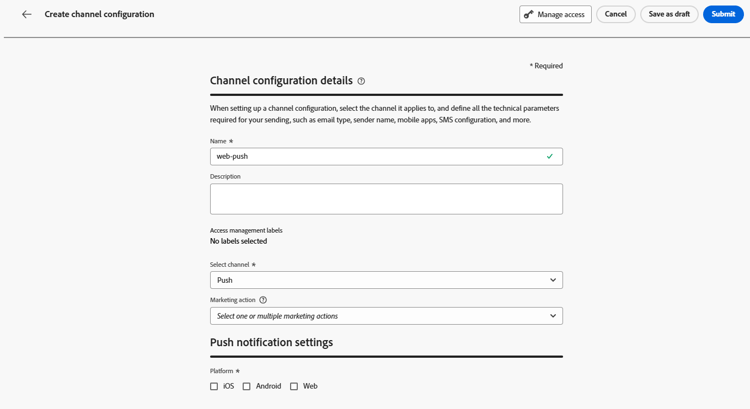 푸시 자격 증명을 만든 후에는 Journey Optimizer에서 푸시 알림을 전송할 수 있는 구성을 만들어야 합니다.