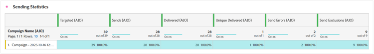 전송 통계 테이블은 라이브 활동 캠페인과 관련된 주요 지표에 대한 자세한 개요를 제공합니다. 여기에는 타겟팅된 대상의 크기 및 성공적으로 전달된 라이브 활동 수와 같은 필수 정보가 표시되므로 라이브 활동의 전체 도달 및 성과를 평가하는 데 도움이 됩니다.