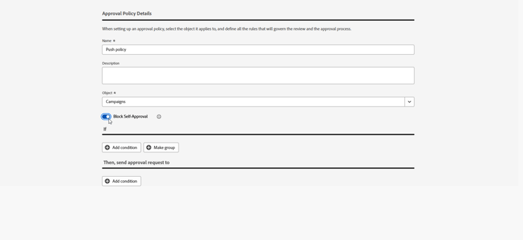 여정/캠페인 작성자가 자신의 개체를 승인하지 못하도록 자체 승인 차단을 사용하도록 설정하십시오.