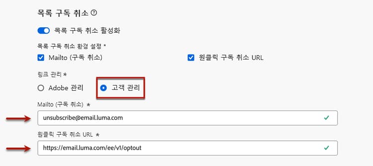 이메일 구성 - Adobe 외부에서 동의를 관리하는 경우 이제 이메일 채널 구성 설정의 일부로 사용자 정의 구독 취소 이메일 주소와 사용자 정의 원클릭 구독 취소 URL을 설정할 수 있습니다. 자세히 보기