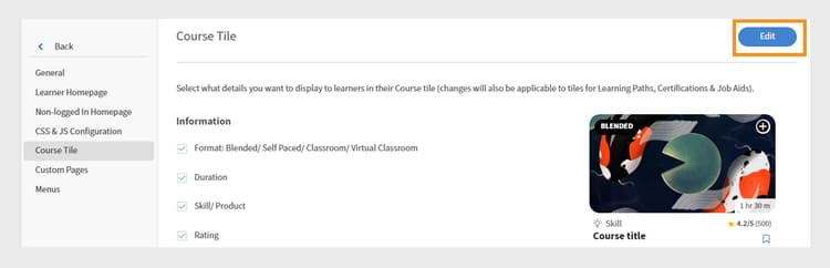 Adobe Learning Manager의 강의 타일 설정 화면에서 타일을 사용자 지정할 수 있는 편집 옵션 표시 -
