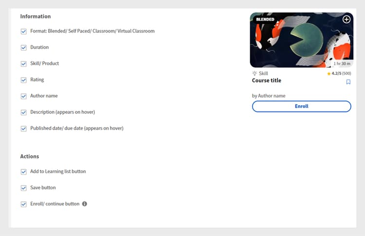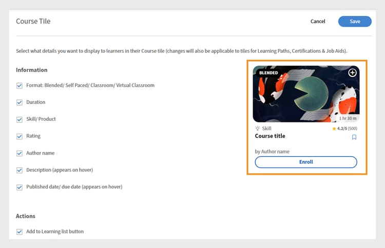 Adobe Learning Manager에서 관리자가 학습자에게 표시할 정보와 동작을 선택하는 강의 타일 구성 화면 -