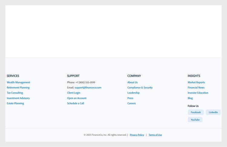 금융회사의 관리자는 사용자 정의 옵션을 사용하여 바닥글을 구성할 수 있습니다. 이 옵션을 사용하면 나만의 HTML과 CSS를 추가하여 바닥글을 완전히 유연하게 디자인할 수 있습니다.