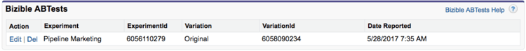 Marketo Measure A/B 테스트 개체가 Leads, Contacts 및 Opportunity 페이지에 관련 목록으로 표시됩니다. 이 목록은 Optimizly 또는 VWO를 통해 실행 중인 모든 실험 및 변형을 표시하며, 이를 통해 특정 리드 및 연락처와 관련된 실험/변형을 확인할 수 있습니다.