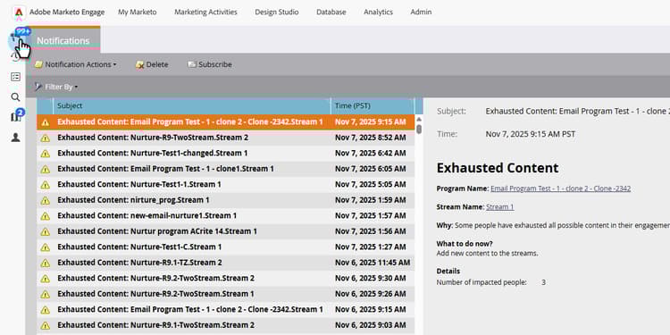 새 알림은 Marketo Engage의 왼쪽 상단에 표시됩니다.