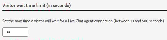 방문자가 대체 메시지를 수신하기 전에 라이브 에이전트에 연결되기 위해 기다리는 최대 시간(초)을 제어합니다. 10초에서 500초 사이에서 설정할 수 있습니다.