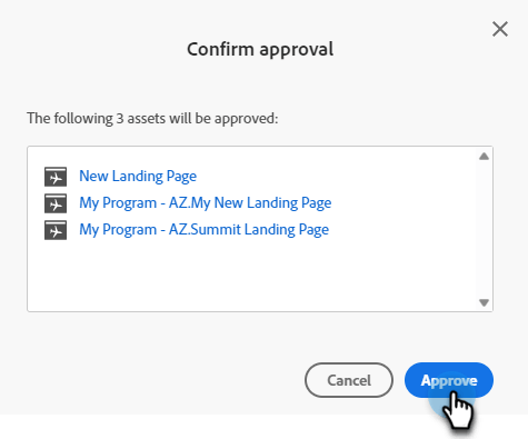 랜딩 페이지를 선택한 상태에서 랜딩 페이지 작업 드롭다운을 클릭하고 승인 을 선택합니다.