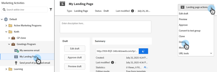 원하는 랜딩 페이지를 선택합니다. Landing Page Actions 드롭다운을 클릭하고 Delete 를 선택합니다.