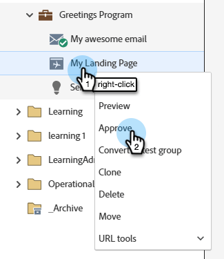 왼쪽 탐색 메뉴에서 랜딩 페이지를 마우스 오른쪽 단추로 클릭하고 Approve 을(를) 선택할 수도 있습니다.