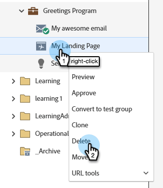 왼쪽 탐색 메뉴에서 랜딩 페이지를 마우스 오른쪽 단추로 클릭하고 Delete 을(를) 선택할 수도 있습니다.