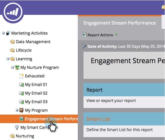 note tip TIP 프로그램 아래에서 보고서를 만들면 프로그램 콘텐츠로 자동 제한됩니다. Engagement Stream Performance을(를) 보고서 Type(으)로 선택합니다.