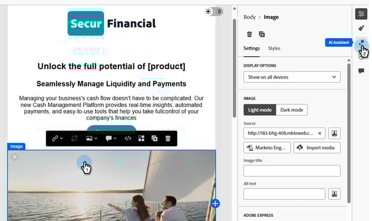 Marketo Engage 이메일 Designer의 AI 어시스턴트는 현대적이고 성능이 뛰어나며 직관적인 이메일을 만들 수 있도록 지원합니다. 이는 Adobe의 생성형 AI 기술과 프롬프트 라이브러리, 그리고 이미지 생성을 위한 Firefly를 통해 특정 페르소나/구매 그룹, 마케팅 여정 단계, 커뮤니케이션 전략, 어조 등에 적합한 콘텐츠를 생성하여 달성됩니다. 특정 브랜드 자산을 활용하여 콘텐츠를 만들 수도 있습니다.