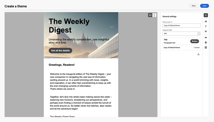 브랜드 테마를 사용하면 이메일 템플릿에 사용자 지정 스타일을 추가하여 특정 브랜드 및 디자인 언어에 맞는 재사용 가능한 콘텐츠를 쉽게 만들 수 있습니다.