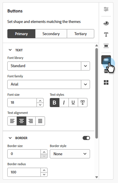 모양, 반경, 텍스트 및 크기와 같은 단추에 대해 색상이 아닌 요소를 설정합니다. 세 가지 사전 설정은 Primary, Secondary 및 Tertiary 입니다.