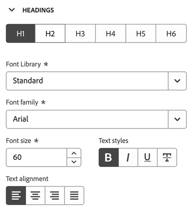 다양한 제목 유형에 대해 글꼴 라이브러리, 패밀리, 크기, 텍스트 스타일 및 텍스트 정렬을 설정합니다.
