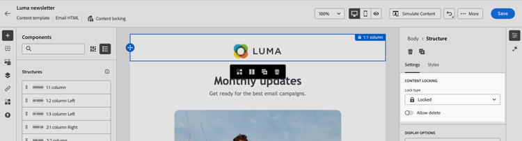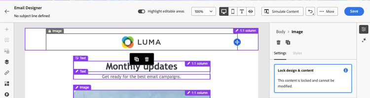 새 템플릿을 만들거나 기존 템플릿을 편집하든 상관없이 이메일 Designer에서 직접 이메일 템플릿에 대한 컨텐츠 잠금을 활성화할 수 있습니다.