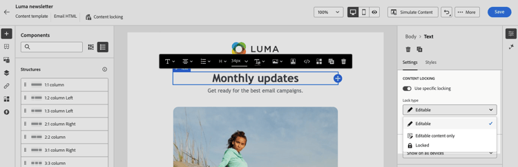 Lock type 드롭다운 목록에서 Editable 을(를) 선택합니다. 스타일을 잠그는 동안 콘텐츠를 편집하려면 Editable content only 을(를) 선택하십시오. 구성 요소를 잠그는 방법을 알아봅니다