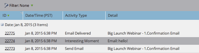 note note NOTE Marketo은 발생한 날짜와 흥미로운 순간을 추가한 방법(예: 리드 작업 > 흐름 단계, SOAP API)도 추가합니다.