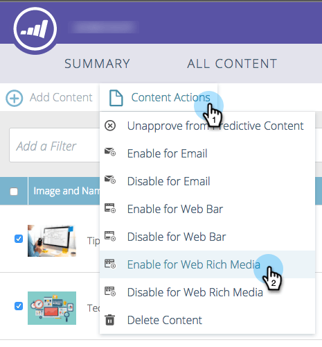Content Actions 드롭다운을 클릭하고 Enable for Web Rich Media 를 선택합니다.