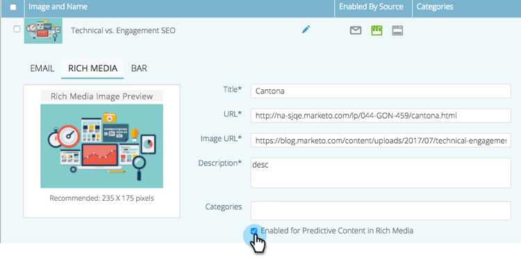 개별 제목을 활성화하려면 제목을 클릭하여 편집기를 엽니다. Rich Media 을(를) 클릭한 다음 Enabled for Predictive Content in Rich Media 상자를 선택하고 Save 을(를) 클릭합니다.