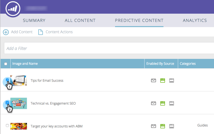 여러 콘텐츠의 경우 Predictive Content 페이지에서 제목 옆에 있는 상자를 선택합니다.