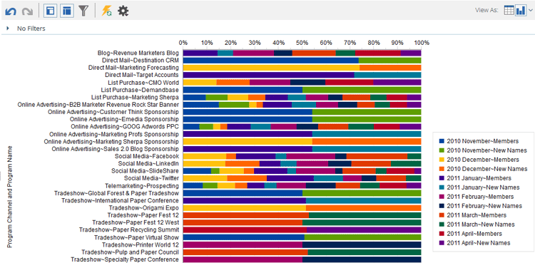 100% Stacked Bar: 테이블의 각 행은 그래프에 하나의 행을 가지며 100%로 조정됩니다.