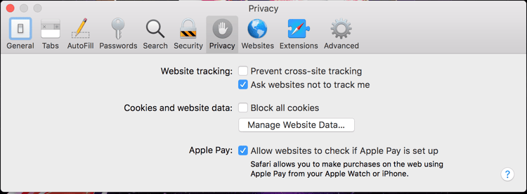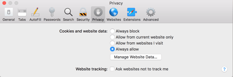 Mac OS X Sierra 및 이전 버전의 경우: 아래 이미지에 표시된 대로 기본 설정에서 브라우저의 개인 정보 탭에 있는 "쿠키 및 웹 사이트 데이터 " 항목에 대한 " 항상 허용" 옵션을 선택합니다.