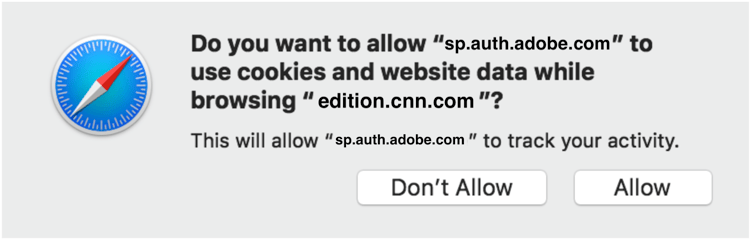Adobe Pass Authentication Service는 기능을 위해 인증 프로세스의 일부로 쿠키를 사용하고 사용합니다. 인증 프로세스가 자동으로 발생하는 상황(예: 임시 패스) 또는 iFrame 또는 "리디렉션 불가" 기능을 사용하는 구현에서 Adobe의 쿠키는 기본적으로 서드파티 쿠키로 간주되어 차단됩니다. 다른 모든 경우에 대해 Safari는 모든 Adobe의 Pass Authentication 서비스 쿠키를 추적 쿠키로 플래그 지정할 수 있는 머신 러닝 알고리즘을 사용하므로 ITP의 차단이 적용됩니다.