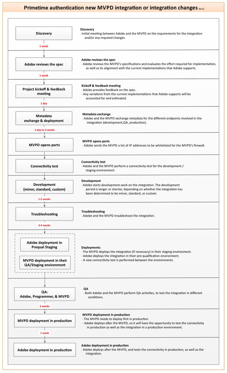 Adobe은 기술 통합이 올바르게 설정되었는지 확인하기 위해 MVPD과 긴밀하게 작업할 수 있는 엔지니어링 시간을 제공합니다. 이 프로세스에는 MVPD의 특정 요구 사항에 맞게 사용자 지정 코드를 개발하는 작업이 포함됩니다.