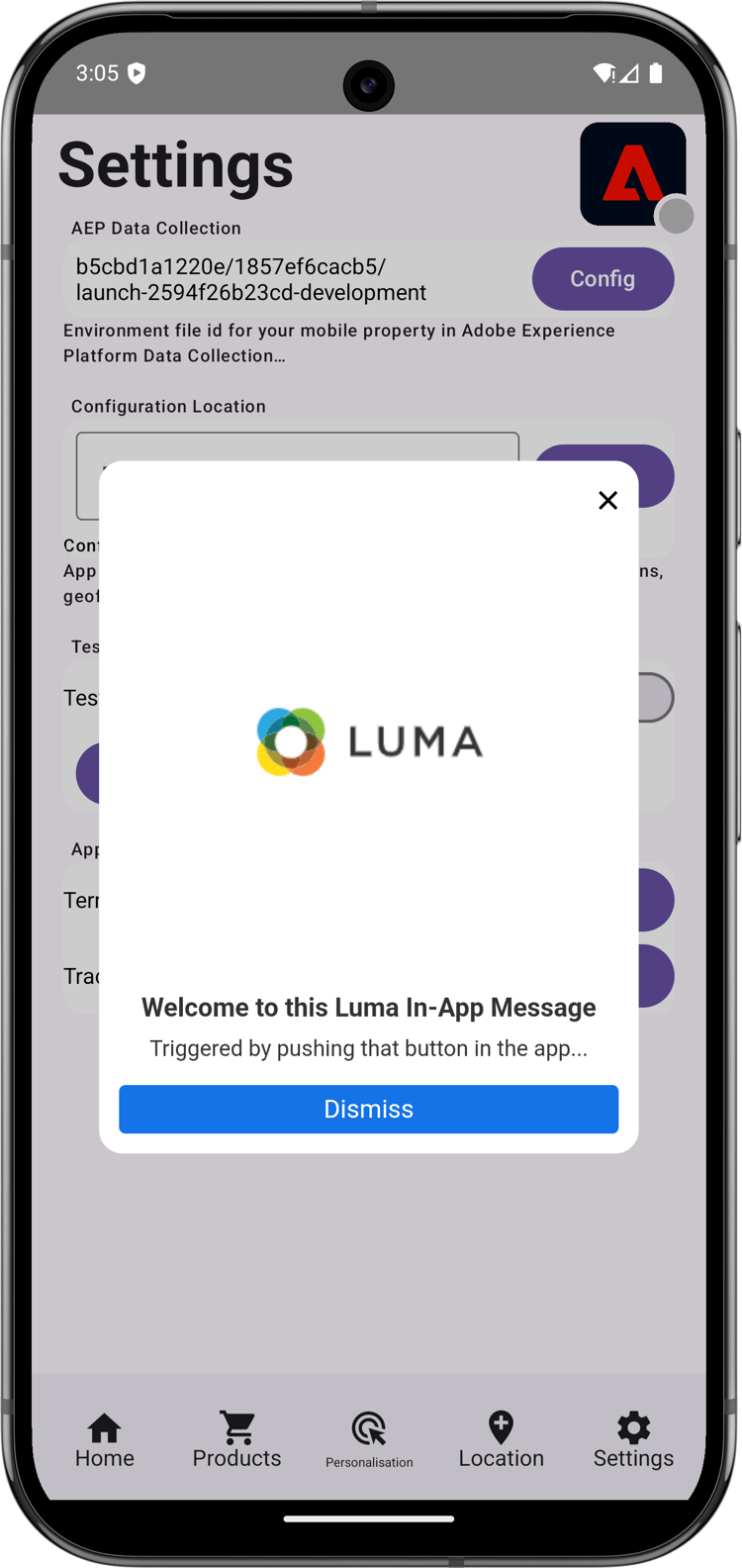 Xcode Project Navigator에서 Luma > Luma > Views > General > ConfigView(으)로 이동합니다. 인앱 메시지 단추에 대한 코드를 찾아 다음 코드를 추가합니다. code language-swift // Setting parameters and calling function to send in-app message Task { MobileSDK.shared.sendTrackAction(action: "in-app", data: ["showMessage": "true"]) }