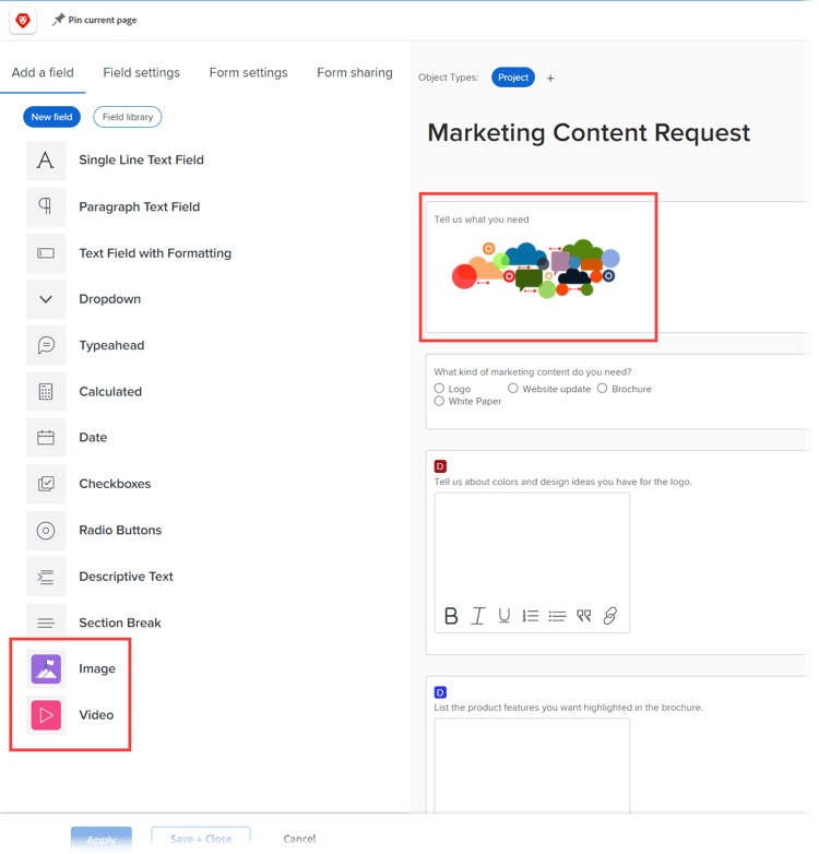 사용자 정의 양식에 이미지를 포함할 수 있습니다. 이렇게 하면 사용자 정의 양식 사용자와 보다 대화형이고 시각적인 방식으로 통신할 수 있습니다. 추가적인 위젯 유형이 곧 제공될 예정입니다.