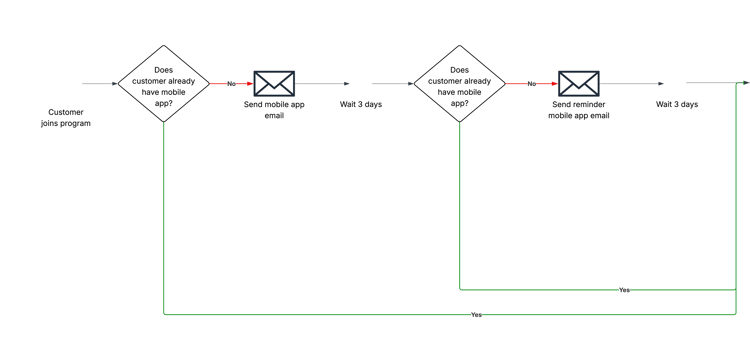 이 여정은 간단해 보일 수 있지만, 이 예에는 고객이 선택할 수 있는 20개가 넘는 고유 경로가 포함되어 있습니다(경로 수를 더 세기 어려워 20개에서 멈췄을 뿐 실제로는 더 많습니다). 어떤 고객은 처음 두 개의 모바일 앱 커뮤니케이션만 수신하고 다른 고객은 여정의 모든 커뮤니케이션을 수신할 수도 있습니다. 세 번째 고객은 여정을 계속 진행하지만 충성도 거래와 관련된 커뮤니케이션만 받을 수도 있습니다.