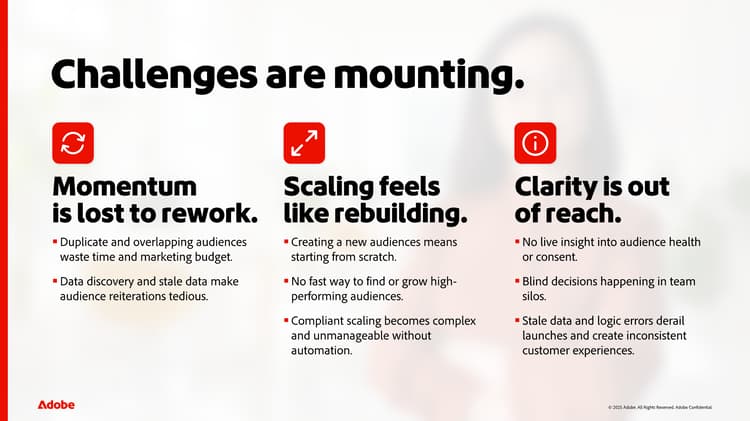 오늘날의 마케팅 팀은 폭발적으로 증가하는 고객 규모, 분산화, 그리고 대상자 도구에 대한 가파른 학습 곡선에 직면해 있습니다. 중복 제거, 모니터링, 문제 해결 등의 수작업은 시간이 많이 소요되어 기회를 놓치고 비효율성을 초래합니다. Audience 에이전트는 지루한 작업을 자동화하고, 실행 가능하고 사전 예방적인 권장 사항을 제공하며, 기술에 익숙하지 않은 사용자를 포함한 모든 사람이 대상자를 쉽게 관리할 수 있도록 하여 이 문제를 해결합니다.