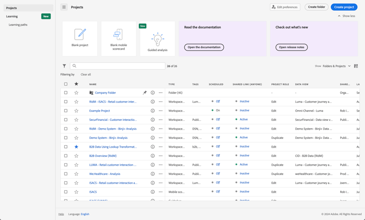 - In Customer Journey Analytics, selecteer Workspace van het hoogste menu en selecteer Lerend van het linkerpaneel.