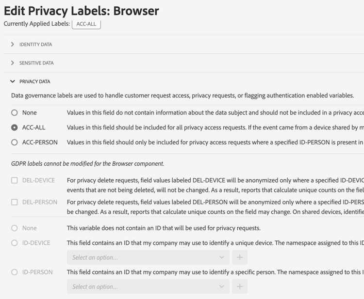 Het labelen van rapportsuitedata betekent dat u labels voor identiteit, gevoeligheid en data-governance toevoegt aan elke variabele in een bepaalde rapportsuite. Zorg ervoor dat u eerst met de etiketten en hun definities vertrouwd maakt.