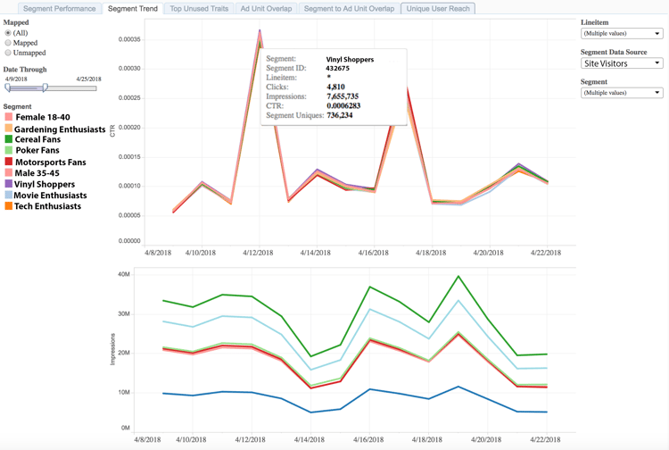 Het rapport van de Trend van het Segment keert gegevens over indrukkingen en klikthrough tarieven van in kaart gebrachte en unmapped segmenten in tijd terug.
