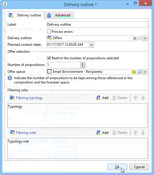 Schakel het selectievakje Restrict the number of propositions selected in als u de aanbiedingsengine wilt aanroepen. Geef de aanbiedingsruimte en het aantal voorstellen op dat in de levering wordt weergegeven.