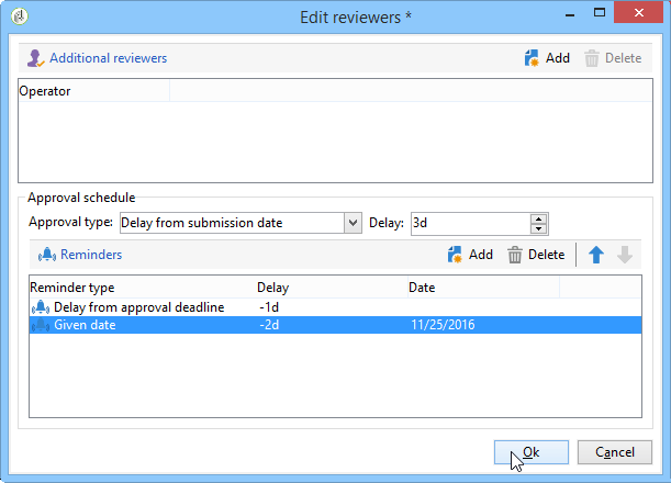 Herinneringen kunnen of op een bepaalde datum en/of x dagen na de voorleggingsdatum worden verzonden. Het type herinnering kan in de eerste kolom van de lijst van herinneringen worden gevormd. In het onderstaande voorbeeld ontvangen de controleurs een herinneringsbericht op de 29/01/2014, d.w.z. twee dagen vóór de in de kolom Date geselecteerde datum, en een tweede herinnering één dag vóór het einde van de goedkeuringsperiode, d.w.z. twee dagen na de indiening voor goedkeuringsdatum.