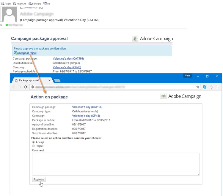 Vervolgens wordt een meldingsbericht naar de controleur verzonden om de beschikbaarheid van dit campagnepakket te bevestigen. Het bericht bevat een koppeling waarmee u de goedkeuring via webtoegang kunt accepteren of afwijzen.