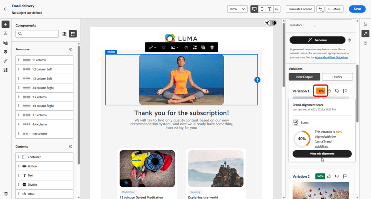 Zodra u uw e-mails hebt gemaakt en gepersonaliseerd, gebruikt u AI Assistant in Adobe Campaign Web om uw inhoud te verbeteren.