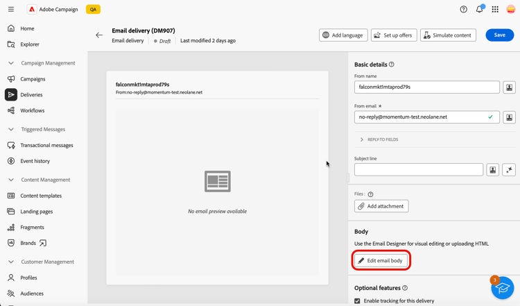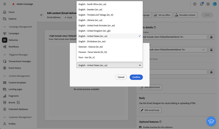 In het Web UI van de Campagne, kunt u opstelling uw leveringen als meertalig, die u toestaat om berichten te verzenden die op de aangewezen taal van een profiel worden gebaseerd. Wanneer geen voorkeur wordt bepaald, wordt het bericht verzonden in de standaardtaal.
